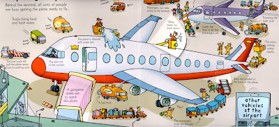 What I like about this book, and assume may be true of the other titles in the Usborne Flip Flap series, is the combination of specific, factual information about various aspects of airport functioning and the good-natured sense of humor present in the drawings. On the "Preparing the Plane" page, you learn that "the plane is cleaned with water jets," that "This tow truck will pull the plane away from its parking spot," and that a truck with a big hose empties the toilet tank of a plane as the passengers exit. Look a little closer, and you'll notice that the man standing next to the toilet truck is holding his nose, and that one of the baggage handlers has picked up a fallen bag and is running after a baggage truck: "Hey!"